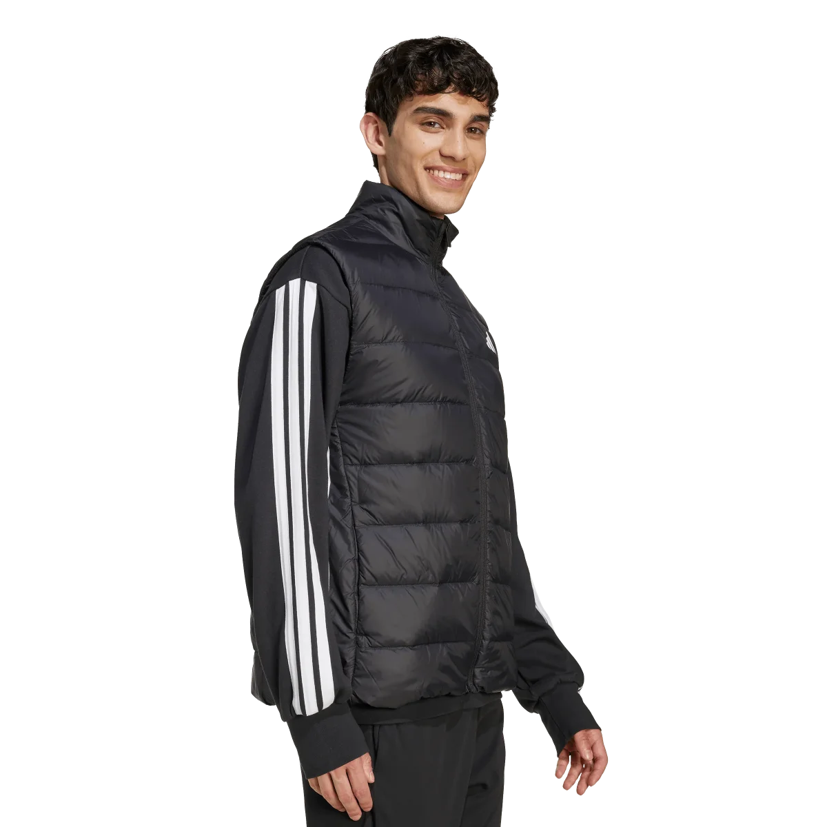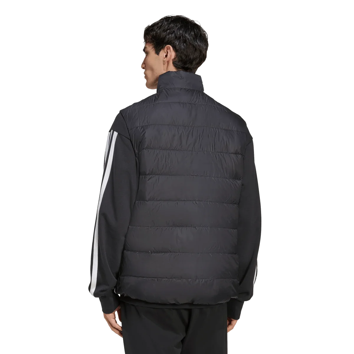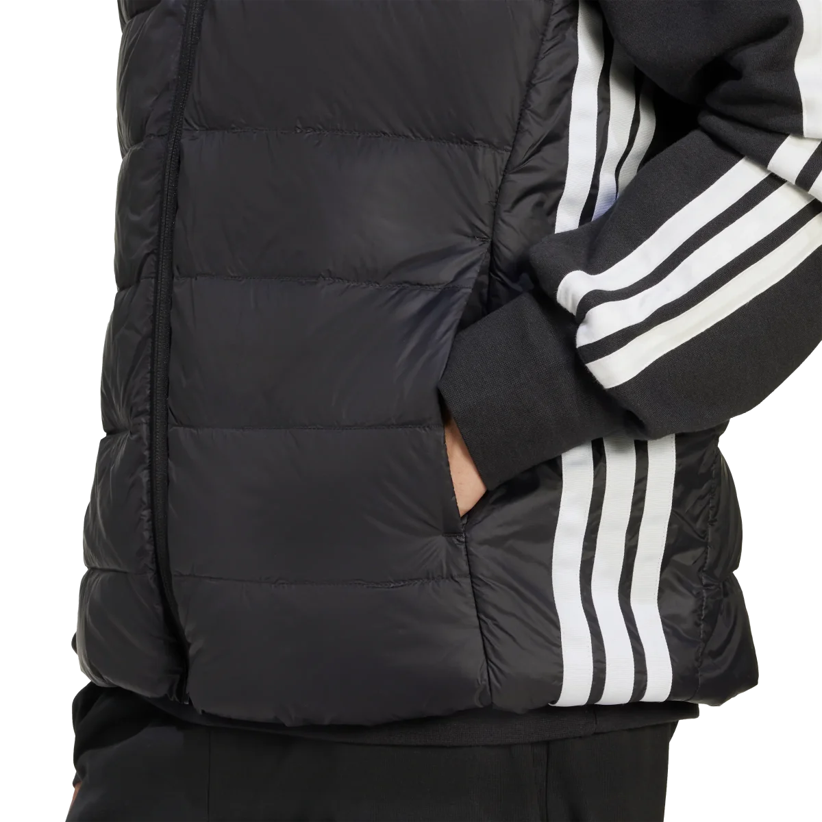 Stay warm and stylish with the Essentials 3 Stripes Light Down Vest. Crafted from 100% recycled polyester woven fabric, this vest features synthetic down insulation, offering a fantastic alternative to traditional down. Designed with a regular fit, it boasts a high collar, elasticated hem, and water-repellent, wind-resistant materials to keep you comfortable in various weather conditions. The two front hand pockets with snap closures ensure your belongings stay secure, while the iconic 3 stripes on the sleeves and heat transfer front logo add a sporty, contemporary touch.